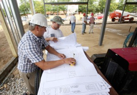 Chad Kemnitz, project manager with Professional Consultants Inc., left, goes over plans with Justin Krantz, electrician with Walser Electric, on the construction site for an ongoing renovation at Russ Darrow Kia at 6525 Odana Road in Madison. The project, aimed at expanding service and body shop capacity, includes a redesigned showroom, upgraded customer lounge, a cafe and a better children's play area, along with a new vehicle delivery area.